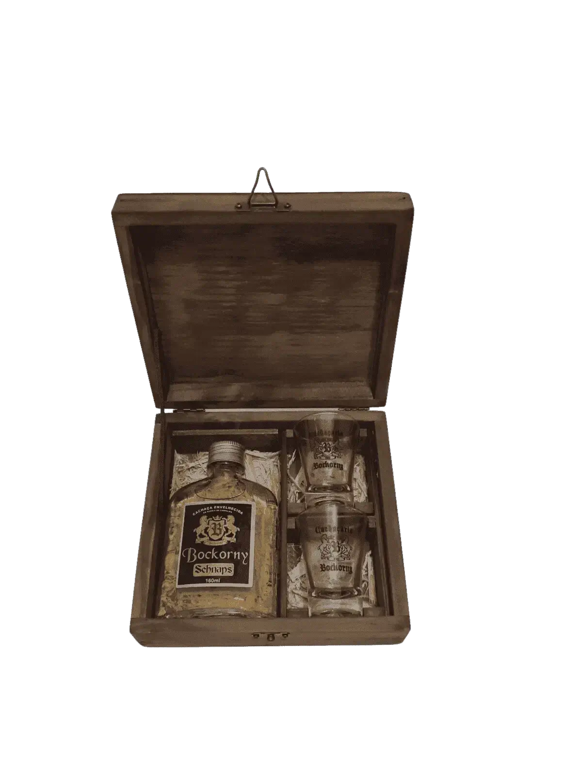 Em até 3x de R$47,33 Cachaça de 160ml em conjunto com 2 copos, em linda caixa de madeira medindo 17x18x7 cm.